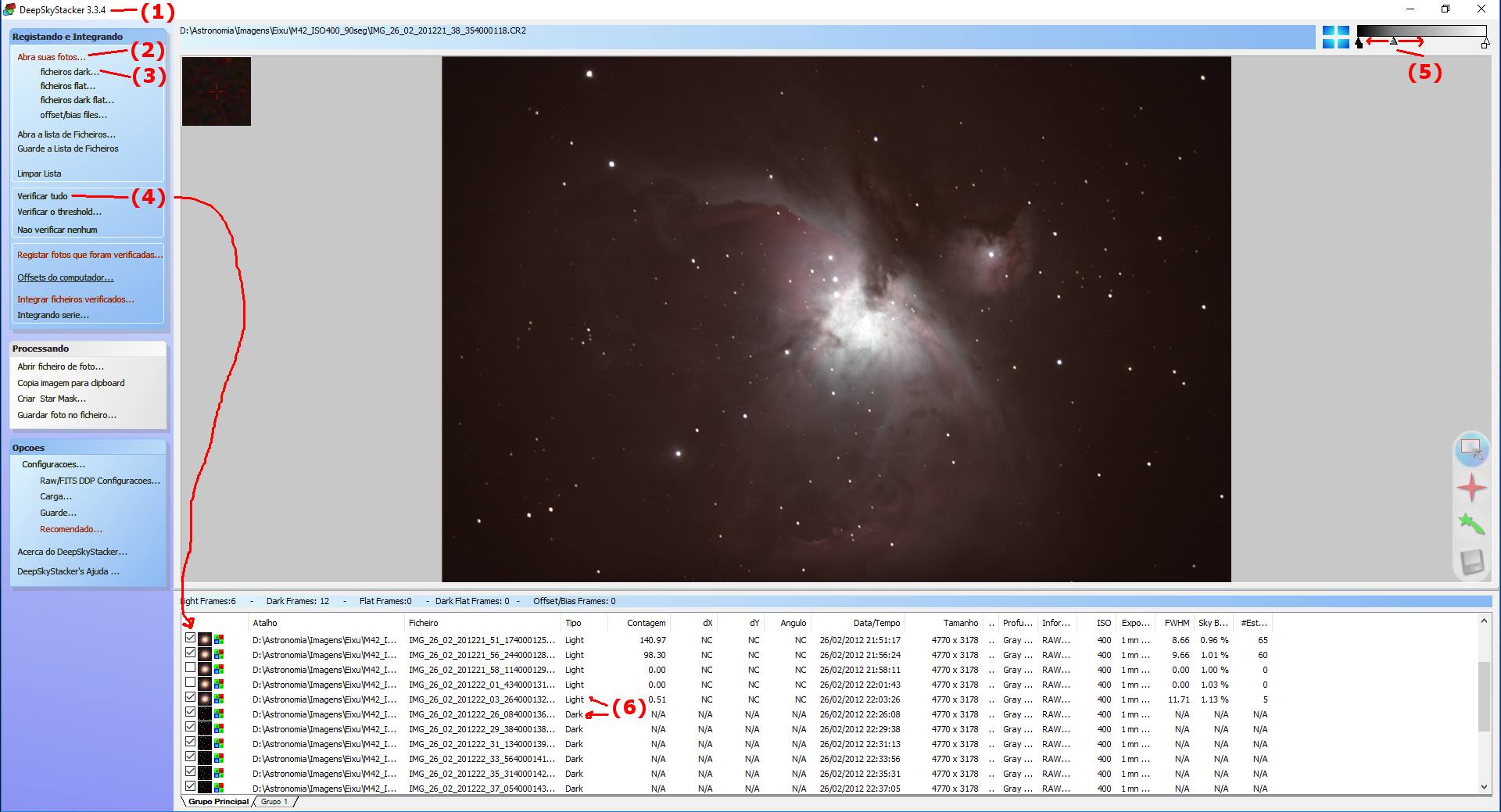 Fotografias não planetárias normalmente são processadas com o DSS (Deep Sky Stacker). Também podemos usar o DSS para ver as imagens a procura de problemas. Na segunda imagem vemos sua tela principal: