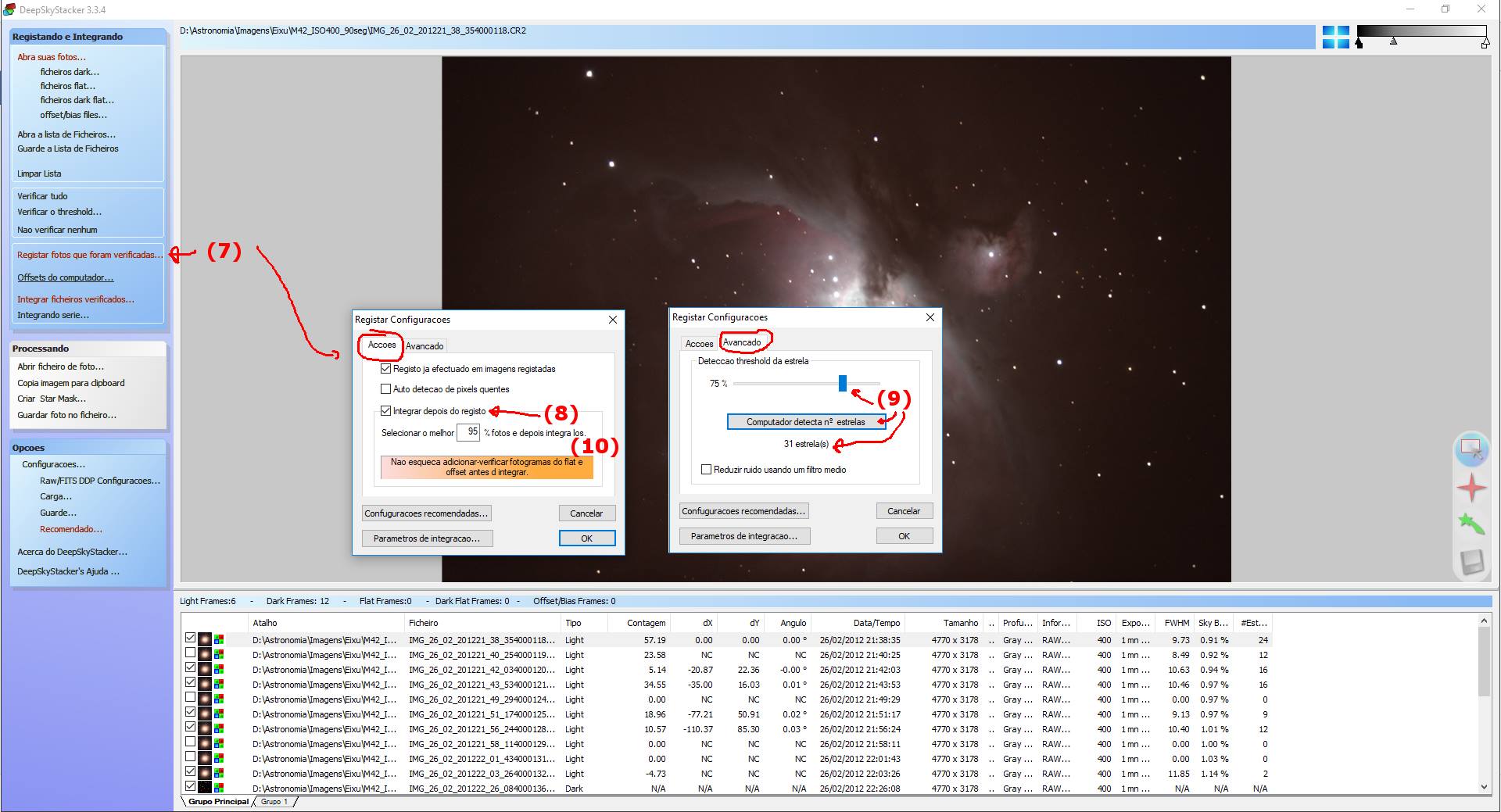 9- Aqui podemos ajustar a forma como o DSS encontra estrelas na imagem (que é a forma dele fazer o alinhamento de uma imagem com outra). Maior a porcentagem -> mais perfeitas e nítidas devem estar as estrelas na foto... Cada caso é um caso, mas qualquer coisa entre 20 e 60 estrelas já dá para fazer algo. O número de estrelas encontradas afeta o método de alinhamento (veremos a seguir, alguns métodos exigem pelo menos 40 estrelas identificadas).