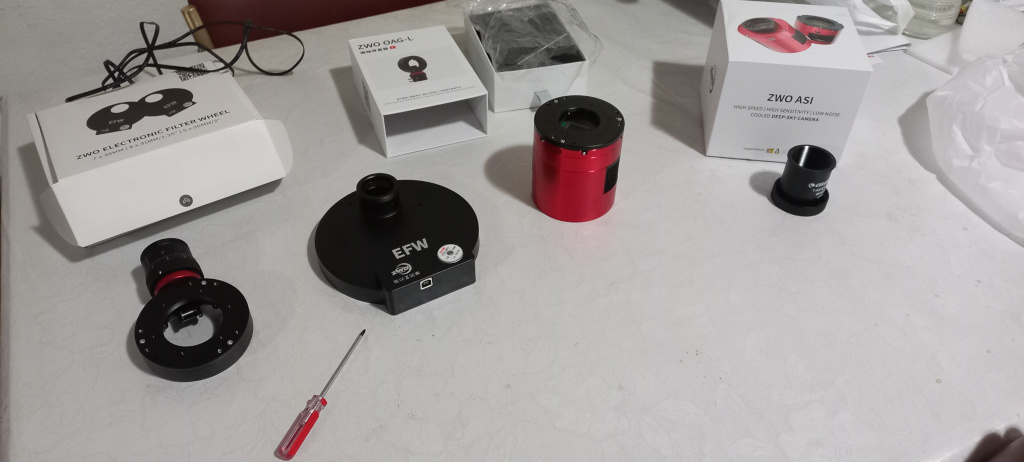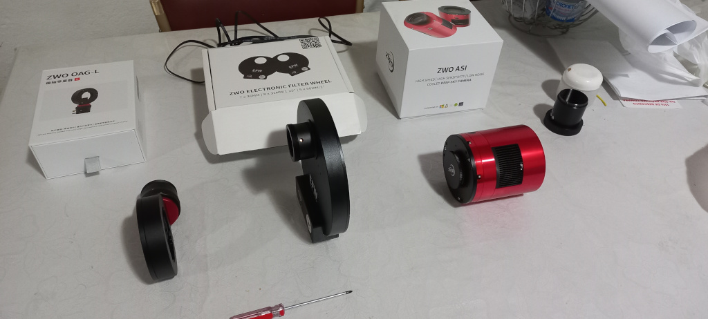 2) A ordem de montura dos equipamentos é Telescópio -> adaptador T 2"-M48 -> OAG-L -> Roda de filtros -> Câmera