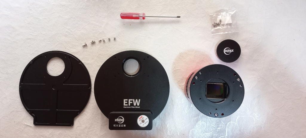 6) Junto com a roda de filtros são enviados vários parafusos (não da embalajem que tem muitos, que são para fixar os filtros no carrousel). Serão necessários 4 deles para aparafusar a base da roda de fitlros no corpo da câmera.