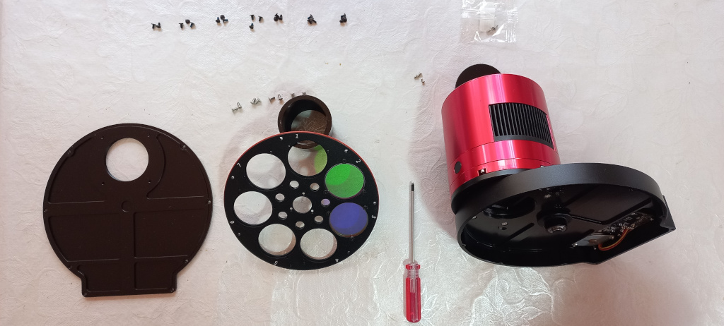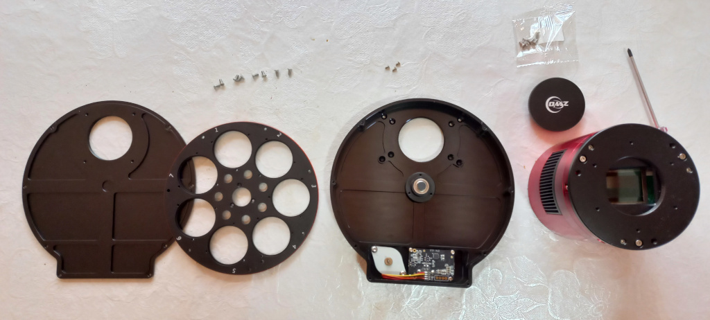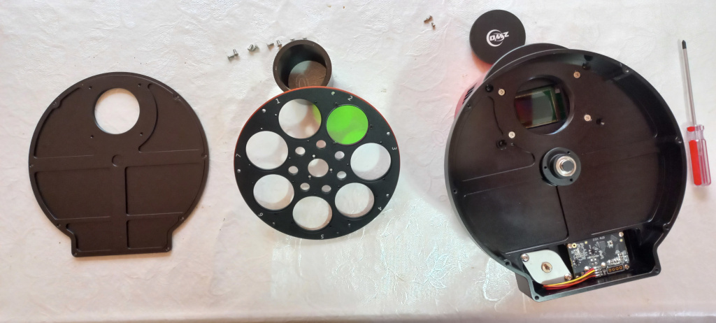 7) Como agora vamos fechar a roda de filtros e depois unir o OAG-l a ela, este é o momento de colocar os filtros no carrousel. No meu caso a roda de filtros é para filtros não montados (sem rosca) de 36mm (o mínimo aceitável para o sensor APS-C da câmera. Com a roda vem uns 20 e tantos parafusos específicos para prender os filtros, São 3 para cada filtro.