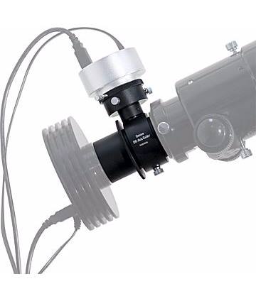 Outra forma, mais comum em cassegrains, é usando um Off Axis Guider (OAG). Maior precisão nas correções! É uma peça que tem um pequeno espelho que desvia uma parte da imagem, que não vai chegar à câmera principal, para o lado. Ali você coloca sua câmera secundária. Esta peça permite girar este espelho (e a câmera então) até encontrar uma estrela.